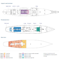 Lido deck with bar, restaurant with free seating in one session, lounge with library and desk area with laptop, hospital, WI-FI, water sports equipment, 2 zodiacs