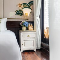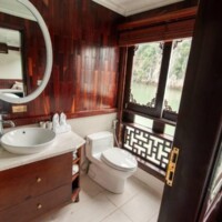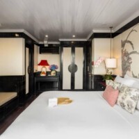 Revel in the 40 sqm of space provided by our 2 Long Quan Suites, the ship’s largest and most sumptuous. Located aft on the Upper Deck, throw open the floor-to-ceiling doors and enjoy expansive, uninterrupted views of the bay from your private balcony with chairs and sun loungers. Inside, a vintage Indochine ambiance awaits, highlighted by dark wood furnishings and flooring and stylish brass accents.