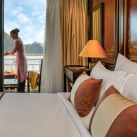 iolet is Heritage Line’s most coquettish French-Indochinese designed luxury vessel. Gleaming wooden floorings, opulent silks, and velvets, selected artifacts and ornaments are distinct appearances of this small Art-Deco ship. Being ‘one-of-a-kind’ sailing the Halong Bay in the Gulf of Tonkin, she grants the highest level of privacy to its residents.